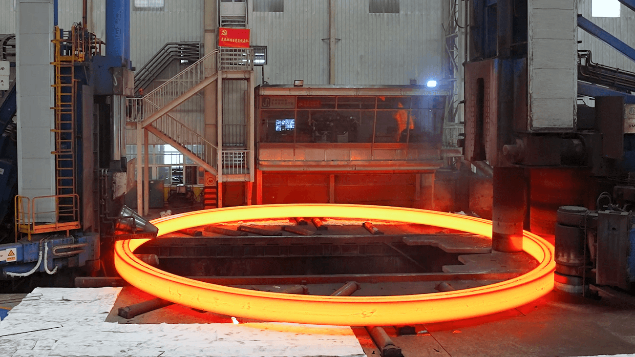 伊莱特采用“整体轧制+近净成形”的方案,通过德国西马克16米轧环机,直接将钢坯轧制成直径15.673米的钢环,使其在周长近50米的直径上,没有一道焊缝。这种成形方式让环件各部位的强度、韧性和耐腐蚀性基本一致,从根本上杜绝了焊接带来的安全隐患。
