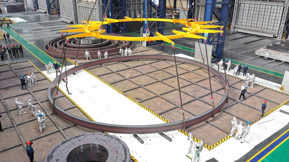 超大直径一体成形无缝轧环,该产品由伊莱特与天锻公司、沃茨公司共同研发的22米全球最大轧环轧筒机轧制成形,其中一件环件母材重143吨、外径21.029米;另一件为某四代核电工程等比例验证件,母材重量280吨、外径18.63米,可为核电项目安全运行筑牢硬件基础。